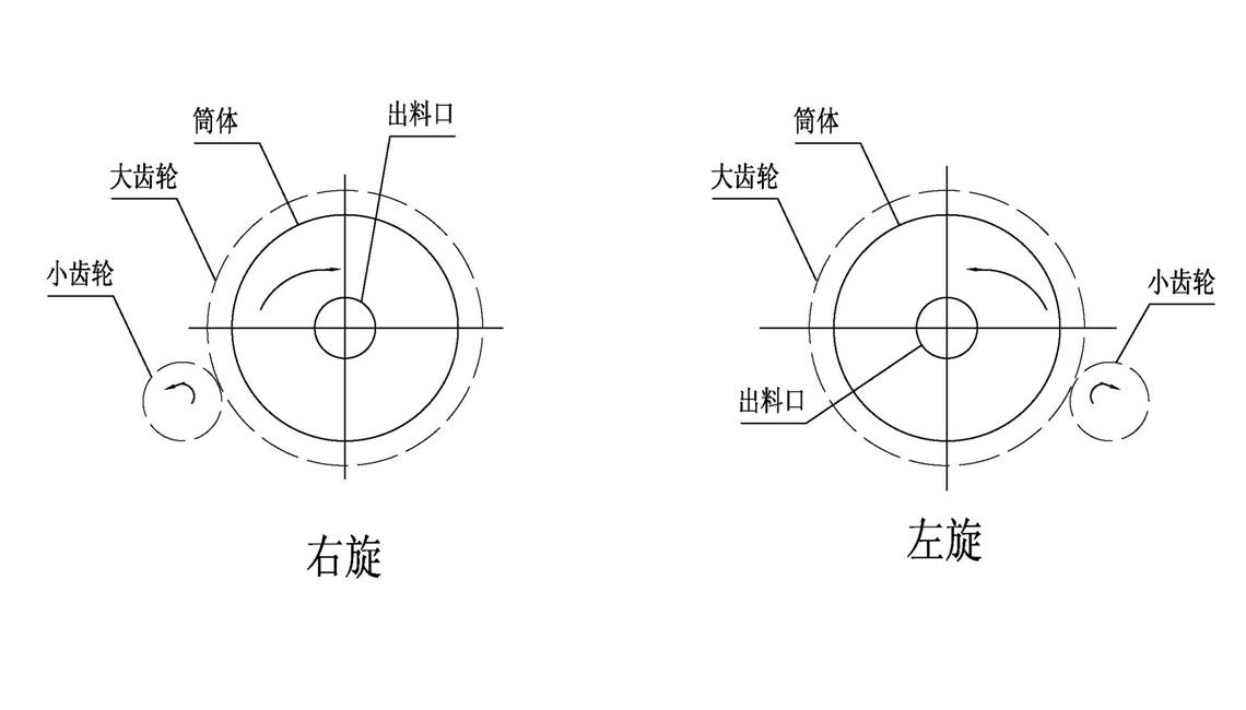 有許多客戶經常會問,怎么才能正確的判斷球磨機運轉時是左旋還是右旋,今天河南豫暉礦山機械有限公司技術人員以圖為為例為大家解這個因惑:要想判斷球磨機是左旋還是右旋,要從球磨機出料口(靠近大齒輪一端)向進料口方向看,筒體逆時針旋轉為左旋,筒體順時針旋轉為右旋;在布置圖上,左旋布置時,傳動部分(過橋)在筒體右側;右旋布置時,傳動部分(過橋)在筒體左側。如下圖所示: