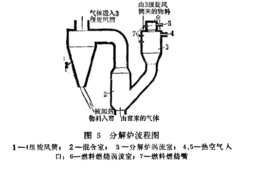 為了調整氣體動力學制度,分解爐內設有節流閘板,它位于混合室的圓錐形異徑管下部。分解爐工作的特性為:它完全依賴于回轉窯的操作制度。分解過的生料粉進入渦流室同回轉窯出來的熱廢氣相混合,并依靠廢氣熱令生料粉達到85-90%的分解。從混合室出來的含生料粉的氣體進入第四級旋風筒,生料粉在該筒內與氣流分開,并沿傾斜溜管進入回轉窯內。