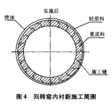 經過與原料廠家、大修部門對該問題的共同探討,較確定將原有兩條澆注料之間的直縫施工修改為有錯臺的施工縫,阻擋在高溫條件下高溫炭粉由施工縫進入輕質料層;剞D窯內襯新施工簡圖見圖4。此項措施較明顯地改善了內襯的使用狀況,次采用就使回轉窯內襯的使用壽命提高到了440天以上。