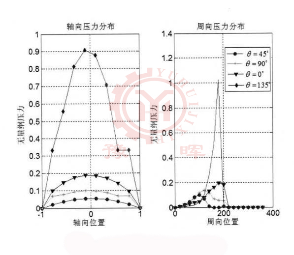 以下顯示的則是球磨機內橢圓軸在不同旋轉狀態下油膜壓力的分布情況,隨著橢圓長軸在主軸處的逆時針運轉,其角度也會不斷的增加,油膜壓力則會出現先減小后增大然后在減小的變化。